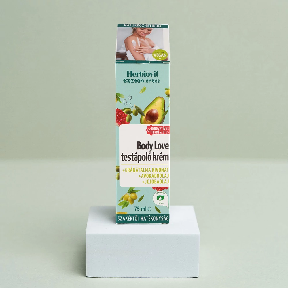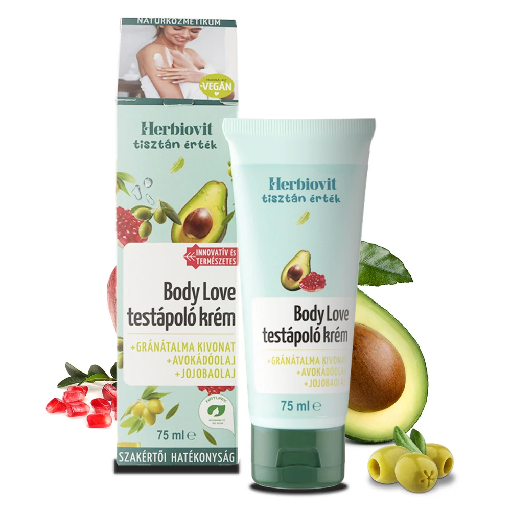 Body Love testápoló krém hozzáadott olívaolajjal, jojobaolajjal, avokádóolajjal, gránátalma kivonattal, valamint E-vitamin és urea hatóanyagokkal. Vegán formula.