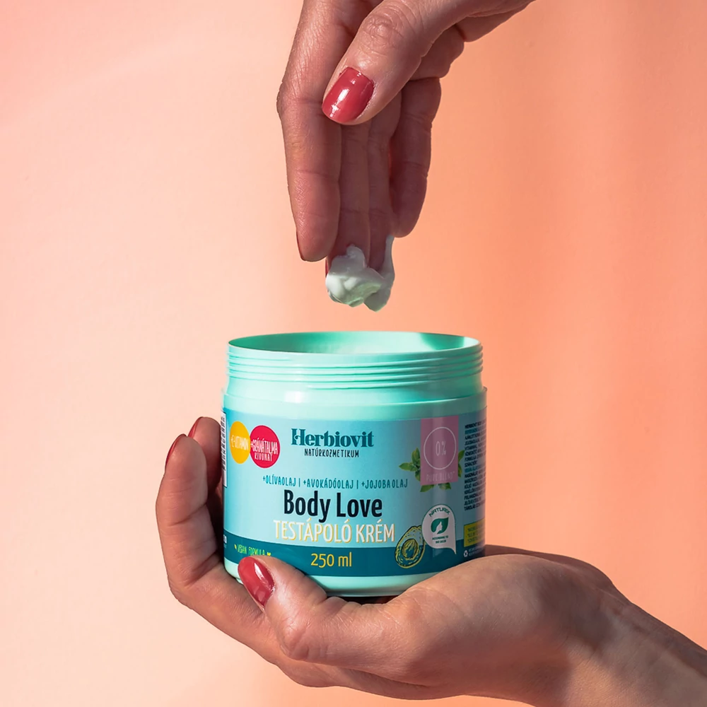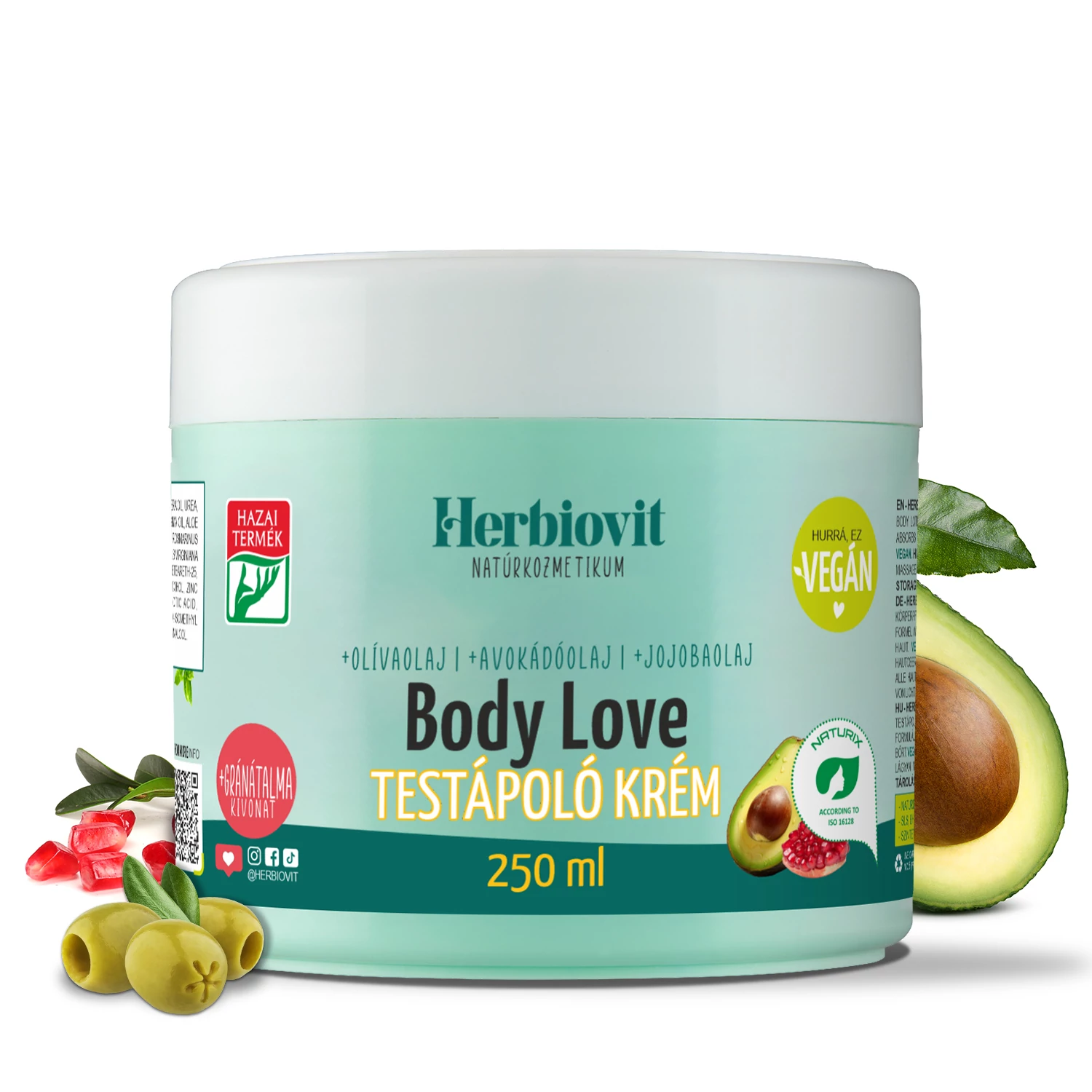 Body Love testápoló krém hozzáadott olívaolajjal, jojobaolajjal, avokádóolajjal, gránátalma kivonattal, valamint E-vitamin és urea hatóanyagokkal. Vegán formula.