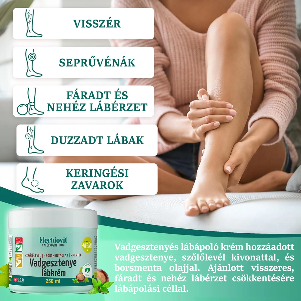 Az általunk forgalmazott vegán vadgesztenye lábkrém biztonsággal alkalmazható, ráadásul szőlőlevél, mentol, valamint borsmentaolajat is tartalmaz, ezért a visszeres panaszok mérséklése mellett táplálja a bőrt és kellemes, hűsítő érzést okoz. Használata rendkívül egyszerű: naponta kis mennyiséget kenj az érintett felületre és alaposan masszírozd a bőrödbe, amíg teljesen fel nem szívódik. A masszázs elősegíti a krémben levő hatóanyagok felszívódását.